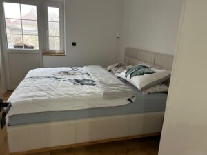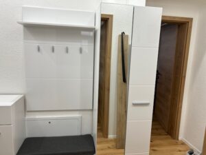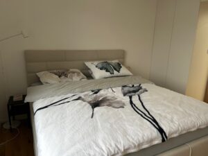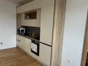 Stanovanje je zelo prostorno in svetlo. Obsega predsobo, kuhinjo z večjo jedilnico ,dnevno sobo z računalniškim kotičkom, spalnico z garderobno sobo in vgradnimi omarami, kopalnico s tuš kadjo in banjo, ločen WC in klet v pritličju. Stanovanje ima tri balkone.